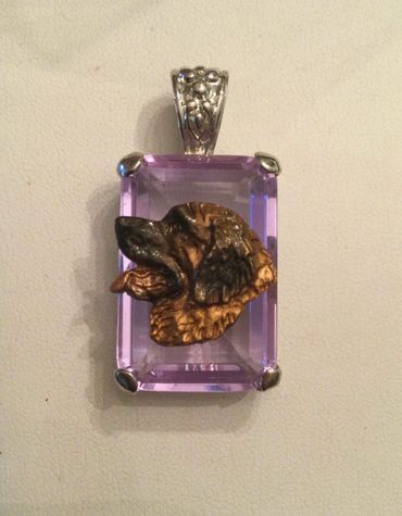 Cubic Zirconia stones, available in many colors (amber, ruby red, emerald green, pink, yellow topaz, smoky topaz,deep blue, aqua blue, amethyst purple /lightand dark, black and clear. Dogs are made of fine pewter and handpainted with great detail. Beautiful pieces that are sure to guaranteed to bring compliments! . Many AKC breeds offered in both headpieces or full body style.. For pics of your breed, email me at sushimom@aol.com. Measure approx 1" X 1 3/4 "